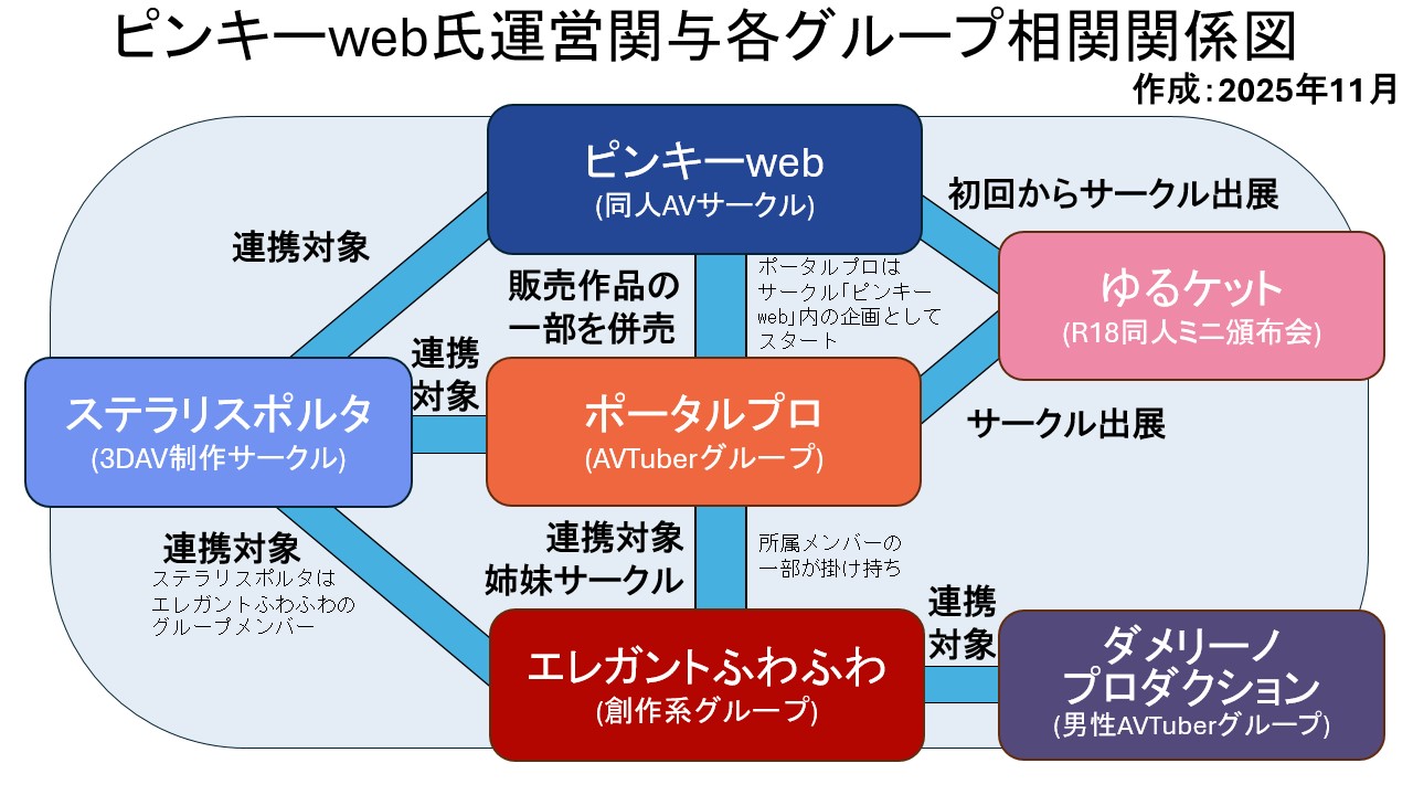| 2025年11月15日 (土) 20:11 | Group Chart.jpg (ファイル) | 177キロバイト | R Train (トーク | 投稿記録) | ピンキーweb氏が運営に関与している各グループの相関関係図です | 1 | |